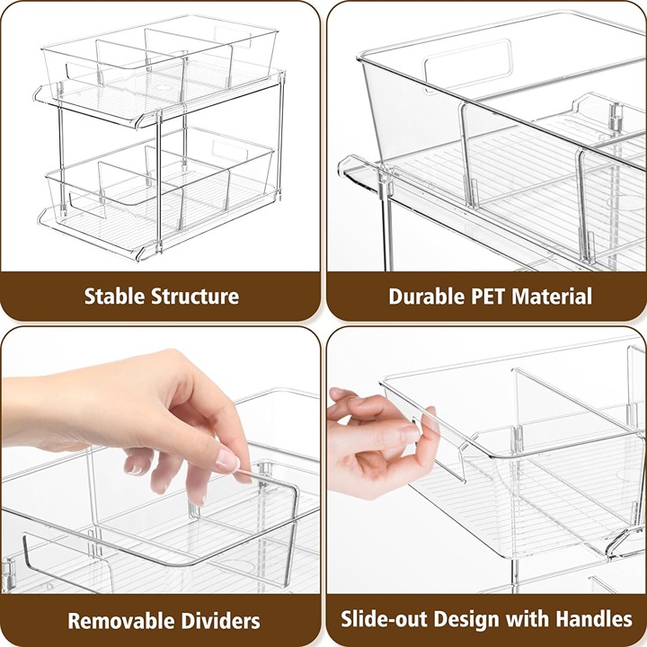 [Multi-purpose Organizer] These versatile slide-out drawer organizers have a wide range of uses, and can help better organize the space in places such as the bathroom, bedroom, kitchen, closet, under sink, pantry and shelf. They can be used as organizers for medicine, snacks, food, beverages, spices, toiletries and skincare products.